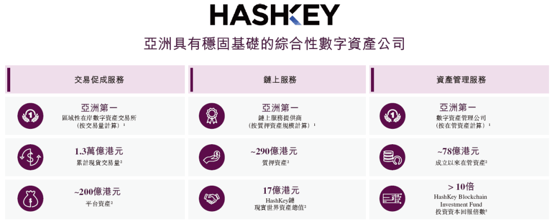 交易所服务 - HashKey为客户提供持牌的市场准入、机构级安全保障,以及与托管、OTC及代币化服务的无缝连接。公司是少数几家提供全天候完全合规入金/出金服务的交易所之一。2023年8月,HashKey成为首批获准同时为专业投资者及零售投资者提供服务的VATP之一。截至2025年9月30日,HashKey的数字资产交易所累计促进现货交易量达1.3万亿港元,成为亚洲具有稳固基础的持牌数字资产交易服务提供商。
